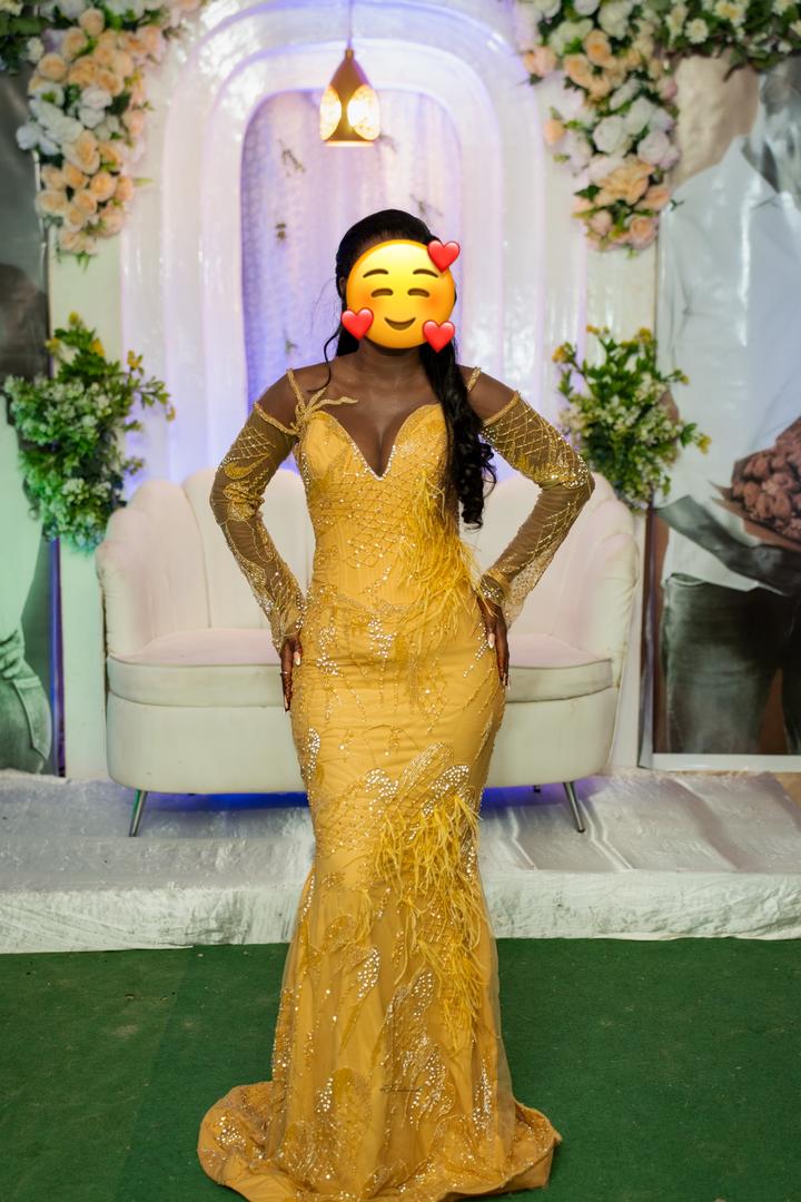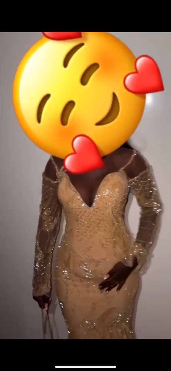 Cette robe en dentelle beige présente des manches transparentes et des détails scintillants. Son décolleté en V et sa coupe ajustée mettent en valeur la silhouette.