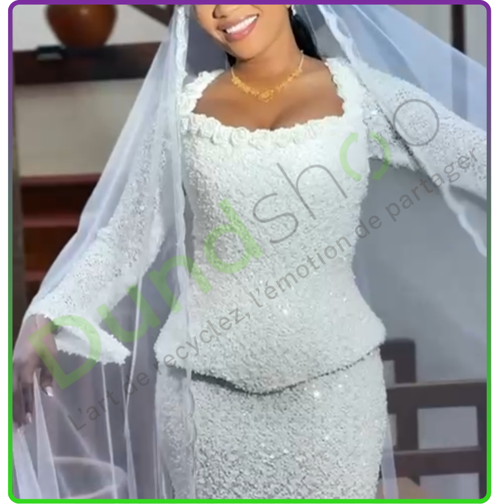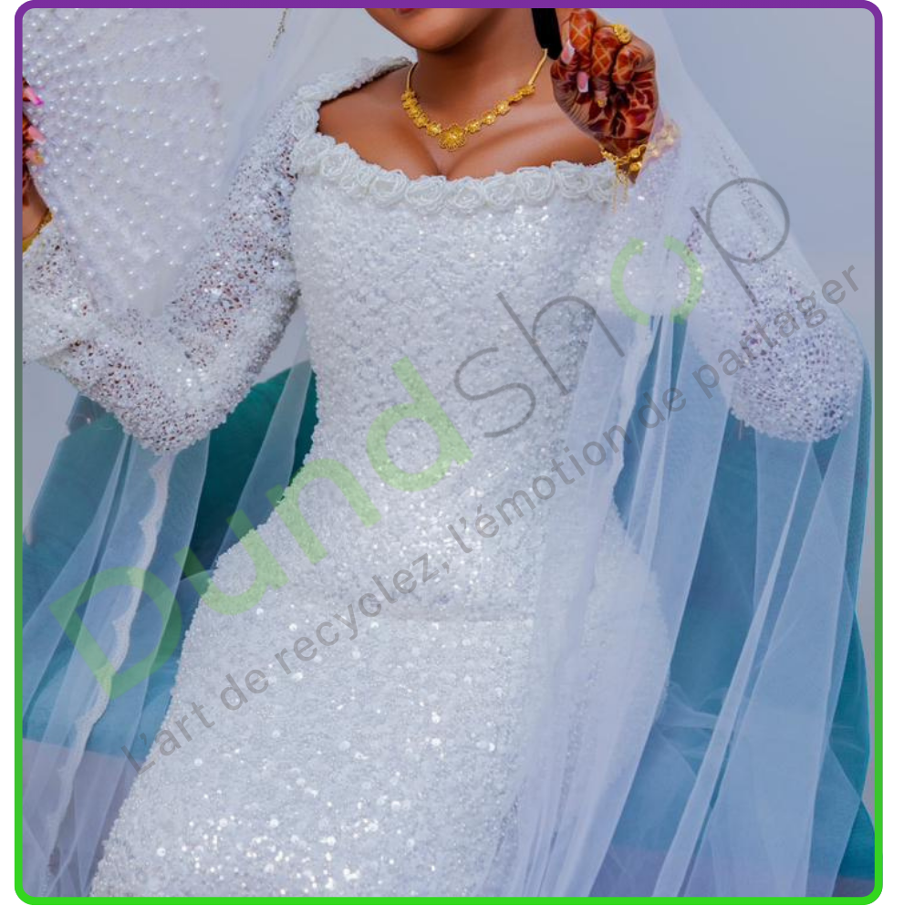 Cette robe longue en tissu cristal blanc est ornée de perles brillantes et d'une traîne élégante. Elle est parfaite pour les célébrer son mariage dans la sobriété tout en restant élégante